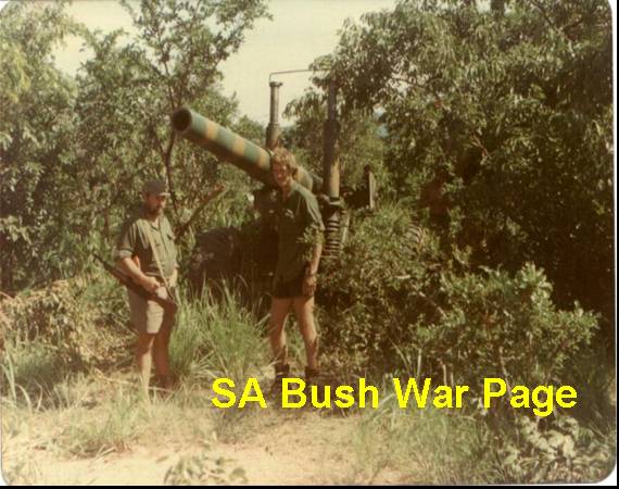 | A SADF 5.5 inch (140mm) gun and crew in Angola during Ops Savannah. Note the casual uniforms, long hair and beards; typical of SADF units after being in the bush for extended periods. The one soldier is carrying an AK 47 rifle. The camoulfage pattern of the gun is non-standard SADF, and was part of the covert action to disguise the units as non-SADF. |
