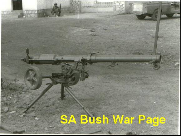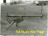| A B10 recoilless AT gun, capured during Ops Savannah. Apart from its AT role, the gun was sometimes used by PLAN (SWAPO) later in the bushwar conflict, to fire harrasing shots at SADF bases in SWA (Namibia). It was normally pulled on foot by the 2 handles at the muzzle end. |