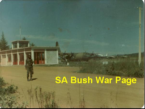 | An FNLA? soldier at Cela airfield. Visible on the airport apron are 2 Cessna 180 observation planes with the distingtive white "T" painted on its top surfaces. This was done to find the planes in the bush, should it be shot down. Aslo visible is a "VIP Dak" with its white top, and a C130B Hercules from 28 Squadron, flying in supplies for the operation. |