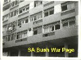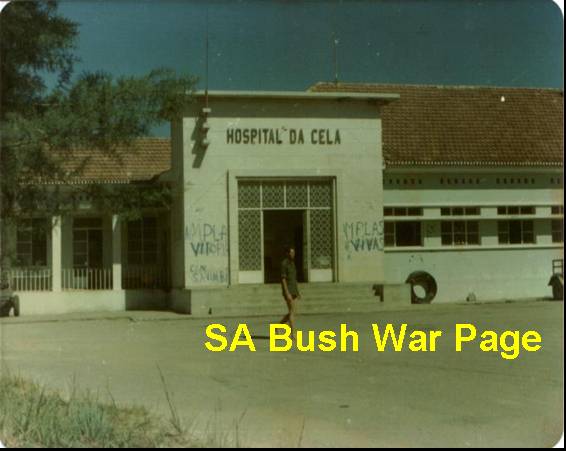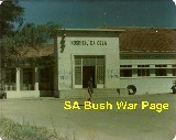 | A SADF soldier in front of Cela hospital. The town of Cela with its airport became an important staging post for the SADF's central front, and the HQ for Battle group Foxbat and Battlegroup Zulu for its drive towards Luanda. Dr Tony Dippenaar was the surgeon in this relaively well equiped hospital. |
