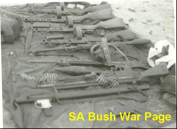 | More small arms captured during Ops Savannah somewhere in a town. Vissible are SKS rifles, limped mines, Ppsh sub machine guns, and a B10 recoilless gun in the background Note the SADF troops inside the building, and the SADF Bedford truck in the background. |