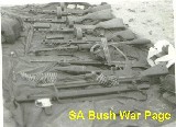 | Small arms captured during Ops Savannah. Vissible are Ppsh submachine guns, RPD machine guns, an FN 7.62mm, ex-Portuguese Heckler and Koch beltfed MG (HK21), and a US-made M72 66mm LAW rocket launcher. |
