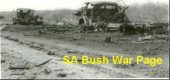 | An enemy (Fapla) ammunition convoy shot out by SADF artillery during Ops Savannah. Note the various unexploded shells scattered around. |