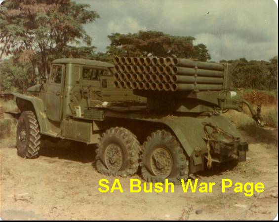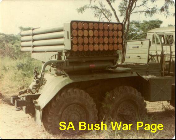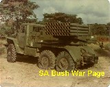 | An enemy (Fapla) BM 21 multiple rocket launcer (Stalin Organ) shot out by SADF during Ops Savannah. Note the barrels are still loaded with rockets. The "Stalin organ" terrified the SADF troops in the beginning of the campaign, as it did not have a similar weapon, but the SADF troops soon learned that this weapon was not very accurate, and its shrapnel not very leathal, as it was made from a very light alloy. This weapon in Angola lead the SADF to develop its own version, the Valkiri, which became operational in the early 1980's. It was alo called the "Voster Organ", after Prime Minister John Voster, the then SA Prime minister. |