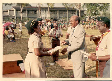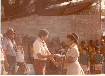 Ms. Susan Singh receiving her certificate as Akela of the newly form 1st. NDSS Cubs Cubs - 1983