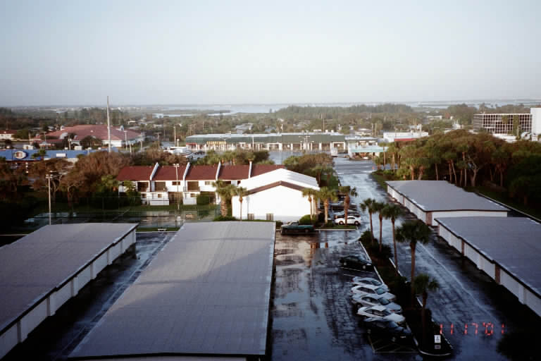 View from the 8th (top) floor of the BeachWinds highrise condominium complex in Cocoa Beach -- looking west (photo taken November 17, 2001). In the foreground is the parking lot with garages. Directly across the street (Route A1A, or Atlantic Avenue) is a Dollar General store where "L" shopped frequently. Near to that is the Anacapri Pizzeria, where "S" and friend Rick dined once (this used to be the location of Krystal Hamburgers, where "S" frequented during his college days. Just to the left (south) of Dollar General is an ABC Liquor store, and behind that was the Cocoa Beach Public Library that displayed many hand-crafted sculptures, artworks, and paintings. To the right (north) of the Dollar General was the Rum Runners Cafe and the Pig and Whistle English Pub, where S&L once dined. In the background is the Banana River, which separates Cocoa Beach from Merritt Island. |