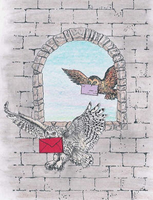 | I usually use Memories permanent dye ink because it gives a nice, strong black color that will not run if you color in your scene using watercolors or markers. 1. Stamp the window; mask with a reverse mask (also called a mortise mask: a mask that covers the surrounding portion, but leaves the window opening exposed for stamping) 2. Stamp smaller owl, making sure part of his wing is stamped onto the reverse mask 3. Remove reverse mask, put regular mask over the window 4. Stamp stone wall, remove mask 5. Stamp large owl on separate cardstock, color, then cut out, making sure to cut around her beak with a craft knife so you can slip the envelope under the beak. Be sure to put some glue on the back of the envelope so it will stick to the owl. Then adhere the owl to your scene. (You could also begin with stamping the large owl, then masking it and proceding from step one above. I did the scene this way because I wanted the large owl to stand out a bit from the rest of the scene. You can't tell by the scan, but in person the owl does seem to stand out more this way.) 6. I colored this scene using regular colored pencils on the owls, sky and window frame. I colored the wall lightly with a taupe colored pencil, then went over that with gray and black chalk. I also went over the sky with a bit of white chalk. 7. Cut around smaller owl's beak with a craft knife, put a bit of glue on the back of the envelope and carefully slip envelope under the owl's beak. * For those who may not know, Hedwig is Harry Potter's mail owl, and a Howler is a special kind of letter that arrives in a red envelope. When opened, the letter shouts at the recipient. (My nieces are Harry Potter fans, too, so I'm going to send them this card in a red envelope, with the message typed out all in capital letters.) |