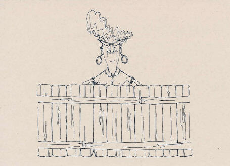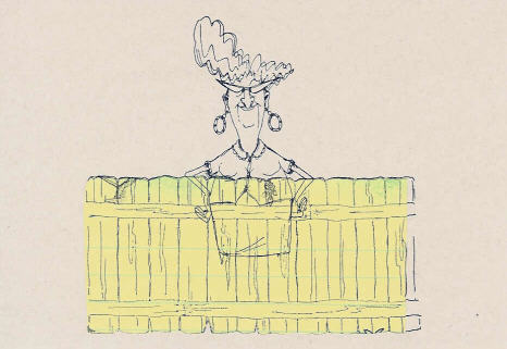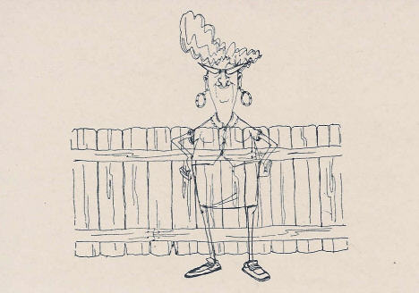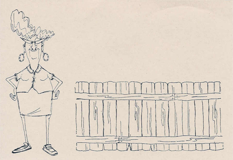 | Here I stamped Eunice, then masked her (using the same method of making a mask, by stamping the image on a Post-It note and cutting it out). Note that I even took a craft knife and cut out the holes made by her arms. Also, notice that I didn't trim the mask around her head - I didn't want the fence to be as high as her head, so I thought I wouldn't need to bother. Well, take a close look at her shoulder on the right side of the picture! I should have trimmed it a bit more, because I lost some of the image of the fence, and had to go back and draw it in with a fine tip pen. |