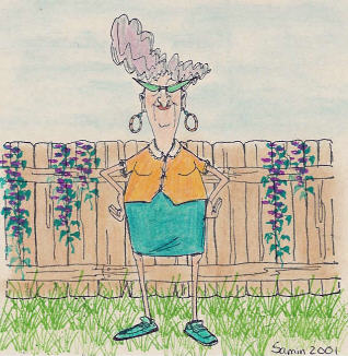 | Here's the finished product! She looks pretty self-satisfied, wouldn't you say? Maybe the grass really is greener on this side of the fence... Speaking of grass: the grass, ivy and flower images are all by Art Impressions. Also, I stamped the grass with the mask of Eunice still in place. By the way, there are several different ways to make masks, aside from using Post-It notes. That just happens to be my preference. Check out the new masking material by Therm-O Web, for example... |