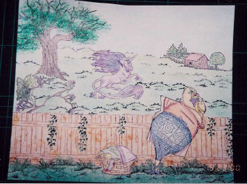 | This is a photograph of my first scene. I used stamps that I already had on hand, not purchased specifically for scenic stamping. The large tree, fence, ivy, laundry basket and Fannie are by Art Impressions. I guess I already showed an inclination toward scene stamping, before I really knew what it was! The long grass is by DOTS (now CTMH) and the small grass is by Darcie's. The unicorn is a partial image from the Stamp Pad, the fairy on the branch a partial image of a bookplate by Rubber Stampede. The small barn and trees were a gift from the owner of Lady and the Stamp. Don't forget to look at your stamps to see what partial images may be hiding within. In any event, I simply used what I had on hand, and put together a scene. But if you want to get serious about making scenes, you'll want to consider a few things. |