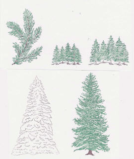 | Here, for example, are a few of the stamps I have of pine trees. Notice they run the gamut from a close up of a pine bough (Personal Stamp Exchange) to two sizes of a group of trees (Art Impressions) to a snow covered pine (Joan Wear) and a plain pine tree (PSX again). Why so many of the same thing? you may ask. The larger trees can be used at the bottom of the cardstock, while the smaller trees seem far away and should be placed closer to the top of the cardstock. The pine bough can be stamped around the edges of the cardstock to make it appear as though we are peering through the branches |