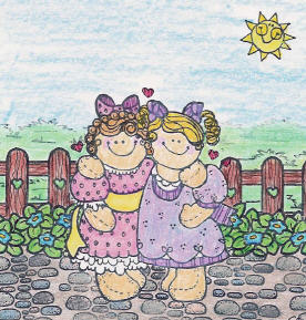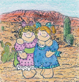 | Say you want to do a scene using these two cuties (a retired stamp by DOTS, now CTMH). First (A) I stuck them in the middle of the desert (all stamps by Beeswax). They look happy enough, but is it really the proper environment for such sweet young things? In the second scene (B), I used stamps (sun by A Country Welcome, all others by Darcie's Country Folk) that have that same cutesy feeling that the stamp of the girls has. I think they look more at home here. Of course, you might want to create a scene that uses the contrast between the cutsey girls and the realistic desert to make a statement. That's fabulous! Just be aware of the way different styles of images work (or don't work) together. |