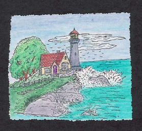 | This pretty lighthouse scene is all one stamp from Joan Wear Designs. All I did was stamp in black Memories ink and color it in using watercolor pencils, chalk and a Dove Blender pen. |