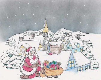 | This charming Christmas scene was made with only two stamps (Art Impressions) - Santa, and the village. I stamped and masked Santa, then stamped the village, using a stamp positioner to get it exactly where I wanted it to be. I colored with regular colored pencils, used chalk for the sky (I masked the village skyline first), and white gel pen for the stars. |