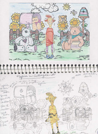 | When I first read about on-line stamping friends keeping a stamping journal, I thought, "Oh, that's not for me. I'm no artist!" But the more I thought about it, the more I liked the idea of having a set place to work out my ideas for new scenes. So I bought a simple spiral bound sketch book and started stamping rough plans of scenes in it. I make notes of what to mask, what to take out of the scene, and what more to add. I sometimes add notes on coloring; which pencils or markers I used, and what techniques I used for coloring in the scene. Once a scene is complete, I include either the original or a reduced color photocopy on the page opposite my notes. Here are two examples: |