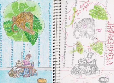 | Here is another example from my journal. Among other things, I noted how I wanted to move the images. Stamps: woman stamping: Art Impressions; cat: part of bookplate stamp by All Night Media; leopard: The Stamp Pad; dark green leaves: Rubber Stampede; light green leaves: Posh Impressions; floral stripe: unknown. |