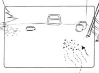 Jacky try to hold down his movement and hits to a paint bucket. | medium long shot | -Jacky -paint bucket |