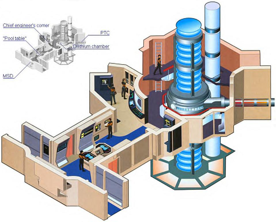 | Engineering Engineering is responsible for the following, Power Generation Systems, Utility and Auxiliary Systems, Environmental Systems and ship board emergency equipment to include fire suppression, structure integrity force field application, lifeboat service, and emergency space hardware. Engineering works in concert with all departments to maintain the balance between demands and resources of a power fed supply system. The Operations Officer is instrumental in allocating resources and personal to insure emergency demands do not exceed engineering capability. Engineering is link directly with all department heads via the Operations Console on the bridge. The Commanding officer or the Executive Officer has priority in the distribution of power to primary ship systems. Ship systems are broken down into two categories, Type I and Type II. The type I are Warp power, Main impulse power, tactical and long range sensor arrays, Deflector systems, phaser banks, torpedo launchers, battle bridge, shuttle bays, emergency environmental systems, lifeboats, and isolation doors and force fields. Type II is the systems that make up the daily operations of the ship to include Transporter, replicator, Holodeck suites, science sensors and labs, and Non-Emergency Medical facilities. Power Generation Systems There are three power generation systems that propel the vessel at various speeds for various purposes. They are Warp, Impulse and Thrusters. These are power systems. They provide power for propulsion and for the type I and type II subsystems on the ship. Warp Propulsion System If you want to be an engineer this is the place to read. The Warp System is the most complex piece of equipment aboard a vessel. It came about when a new technology was developed that replaced propulsion dependent on explosive exhaust reaction products. It was dubbed �warp� because that is precisely how it works on energy in the warp core. The warp core is made up of two rectangles with the tips pointed at each other. Matter is �squeezed� from the upper magnetic constrictors while antimatter is injected from below by the antimatter reactor injector. Both streams land at exactly the same coordinates within the reaction chamber. Layers of field energy exert a controlled amount of force against the next outermost field. That cumulative force is known as asymmetrical peristaltic manipulation. That force is captured in the field coils and energize then stored in slush tanks to be distributed into the electro plasma system (EPS) which routes the energy to the systems on the ship. There are two distinct reaction modes. The first is a high level of energy channeled to the EPS for standard fusion reaction for ship functions The second mode makes full use of the dilithium causing a partial suspension of the reaction, creating the critical pulse frequency that is sent to the warp engine nacelles. Both of these modes operate simultaneously while the ship speeds at warp. Warp speed is velocity times the speed of light. Warp 1 is warp to the first power times the speed of light and so on up to Warp 9 which is 9 to the 9th times the speed of light. The amount of energy required to obtain warp is measured in cochranes. The Eugene�s Limit states that warp stress will increase up to but never reaching a value that corresponds with Warp Factor 10. At Warp 10 the energy value would be infinite and unattainable by a warp core on a star ship. This is due to the energy field layers rising to unattainable frequencies that exceeds a flight system�s ability to control trajectory as mentioned in the limits imposed by Planck Time. It is not within the capability of science for an object to occupy all points in the universe simultaneously without some rather nasty reactions from the objects that were already there first. Even with the restrictions Warp 9 is faster than anything we have yet to achieve and on par with what �Q� can fast ball a ship at which has been calculated at Warp 9.9999999996. Impulse Drive The impulse drive is a fusion-powered engine which propels the ship at sublight speeds and powers auxiliary and utility systems on the ship. There are at least two impulse engines on a ship, one for the battle section and one for the saucer section. Both must be operation to obtain speeds of � and full impulse. The fuel supply for the Impulse systems is contained within the primary deuterium tanks in the battle and 32 aux cryo tanks in the saucer section. For overthrust during emergency flight a small amount of antimatter can be injected into the impulse reactor chamber for short periods of time to increase power generation. There are no transfer capabilities of antimatter between the two vehicles. Thrusters Thrusters are maintained on line with both the warp and impulse drive or online separately by activating the �power on panel� in engineering, Operations, or Helm. The thrusters are 6 sets of two fusion generators which provide bursts of plasma stream to make slight course and bearing adjustments during flight. The thruster nozzles are located port and starboard, aft and forward, nose and rear hemisphere. Utility and Auxiliary Systems The major components of the Utility and Auxiliary Systems are the tractor, transporter, replicator, turbo-elevator(TL) waste disposal and holodeck. All 5 of these systems network off the EPS. Major power is supplied from the warp power conduits and the main impulse engines to run the fusion generators. A secondary power distribution systems provides electrical power for the specialized requirements. Environmental Systems The least complex system aboard the ship is the environmental and life support system. This key element to crew survival has multiple redundancy to eliminate atmospheric deprivation from forces beyond crew control. The system is comprised of atmospheric, gravitational, and life support networks which are all interconnected with fail-safe ship wide breathable atmospheric conditi