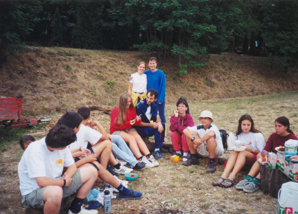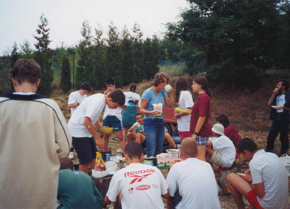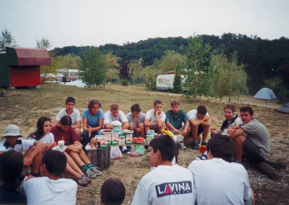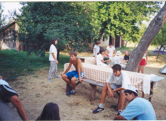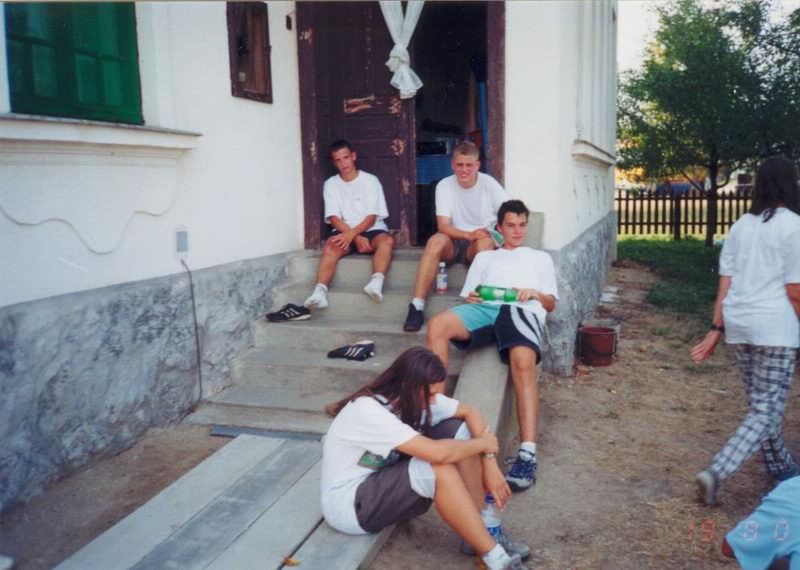 Egy fárasztó focimeccs után a parókia árnyékában pihegve várja a csapat az ebéd elkészültét .