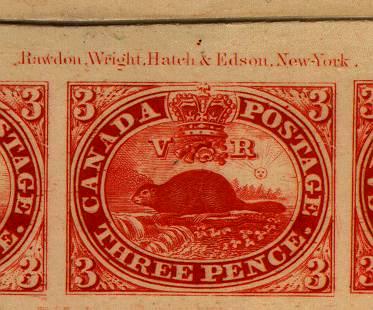 The first printing was from a lithographic plate, but Canadian authorities insisted that the Canadian stamp be engraved. The contract was given to an American firm, Rawdon, Wright, Hatch and Edson, the firm that printed the first U.S. stamp. They were printed in sheets of 200. The order was for 100,00 at 20cents per 1000. In 1856 the printers received permission to print the stamps in lots of 100 to make gumming easier.