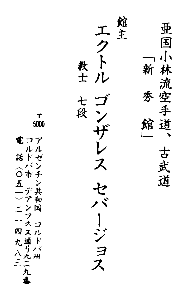 * Primeros pasos en Febrero de 1967 * Primer Cinto negro en 1971 * Ayudante Instructor: 1970 * Primer Doyo en el año 1974, como 2º Dan en el Jockey Club Córdoba * Actual categoría: 7º Dan, desde 1993, obtenida en Santos -Brazil, homologada en Okinawa (Japón) durante ese mismo año. * Presidente de la Asociación Shorin Ryu "Shin Shu Kan" de Karate Do y Kobudo de Argentina. * Vicepresidente de la Federación Internacional Unión Shorin Ryu Karate Do |