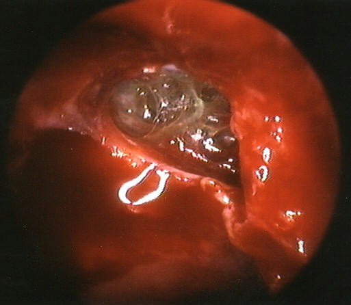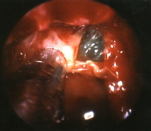 Another patient with a left sphenoid sinus CSF leak that had resulted in several bouts of severe meningitis. The face of the sphenoid has been taken down and we are looking into the sinus itself. The suction is pulling on the mucosal flap that partially covered the superior sphenoid sinus. |