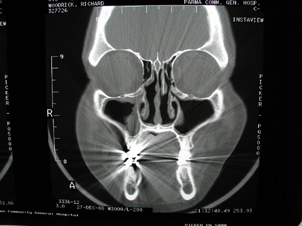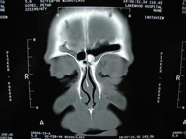| The patient above had a fascinating CT scan. He basically has no nasal floor, as the maxillary sinuses extend below his nasal cavity, and replace his hard palate. His sinus surgery was surprisingly straight-forward and he healed rapidly. |