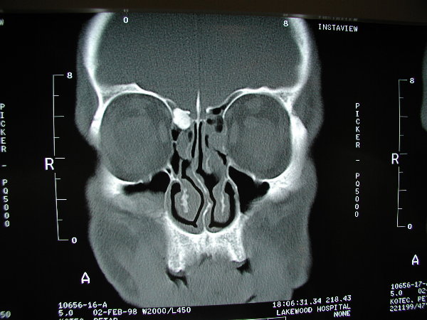 | The patient above had two separate osteomas within his sinuses. On the right it is within the frontal sinus outflow tract, and on the left it is within the frontal sinus iteslf. The osteoma on the right was very symptomatic, causing obstruction and severe pain, while the left was asymptomatic. The right was removed endoscopically, and the left is being observed for the time being. An osteoma is a benign boney growth that can grow and occlude paranasal sinuses and cause problems. |