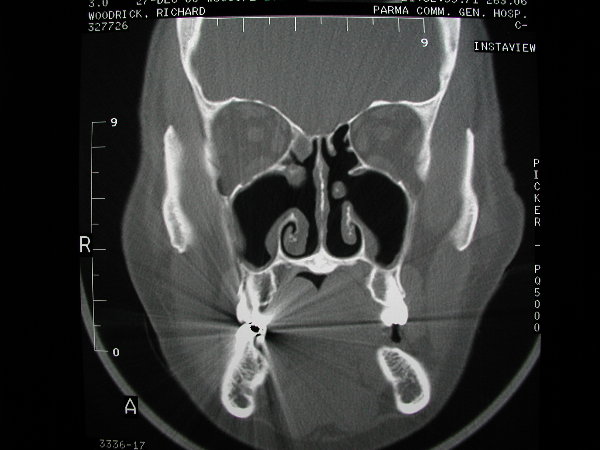 | The patient above had previous sinus surgery. Maxillary antrostomies were created which did not incorporate the patient's natural maxillary antrostomies, hence his symptoms persisted. Careful evaluation of his CTs and appropriate connection of his natural to iatrogenic ostia led to recovery. |