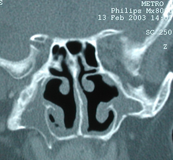 | This CT depicts a fascinating finding: the patient has a concha bullosa of the left inferior turbinate. Furthermore, the IT air pocket connects to her maxiallry sinus. Also (not shown) the nasolacrimal duct drained into the maxillary sinus rather than the nose. They presented with nasal obstruction: a turbinate outfracture was performed AFTER the air cell was opened into the inferior meatus. |