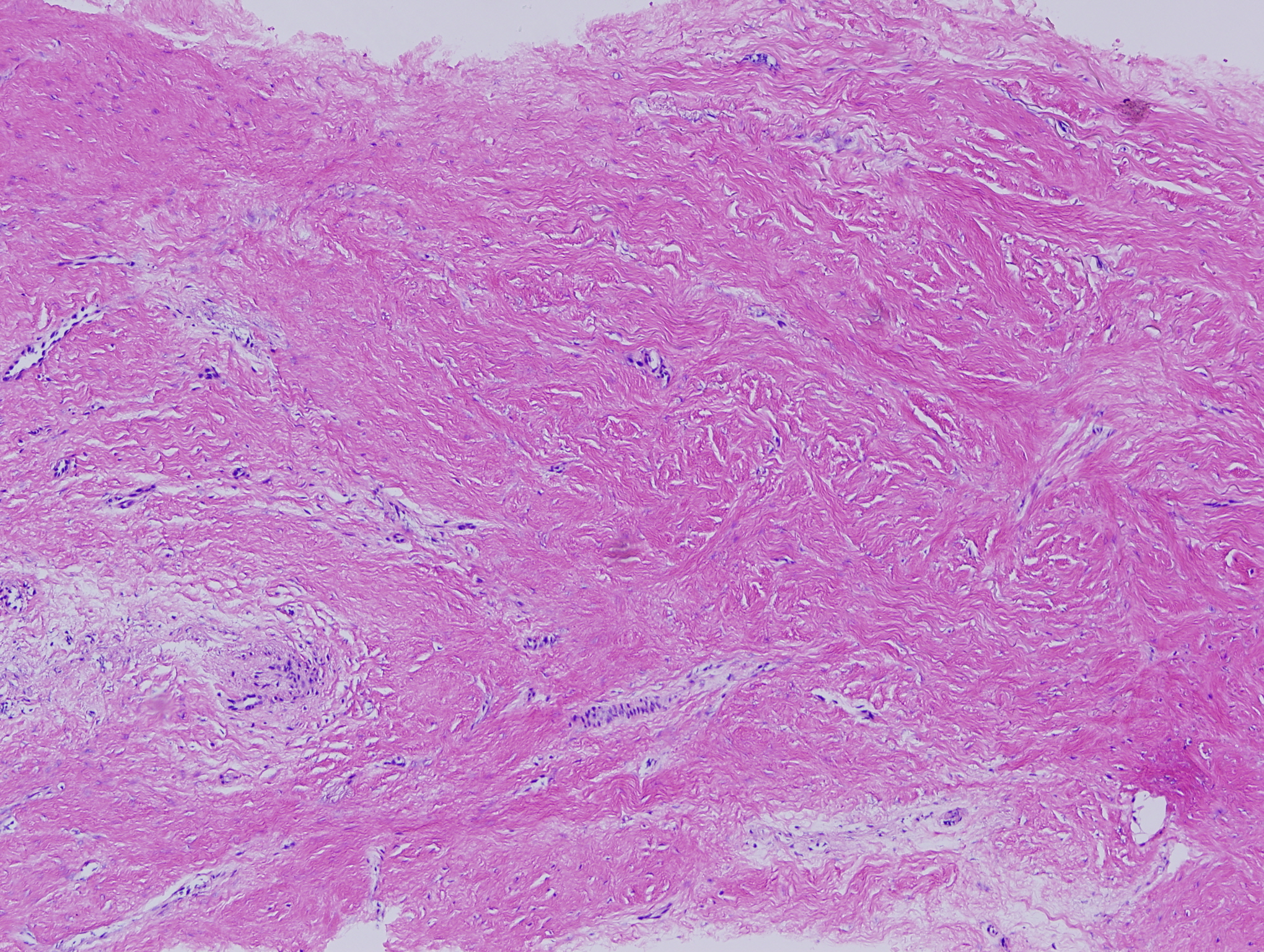 | This photomicrograph depicts Alloderm that was placed 6 months prior to this biopsy (a small section removed while adding more). Note how robust and "alive" the tissue appears: ingrowth of vessels, fibroblasts, collagen. |