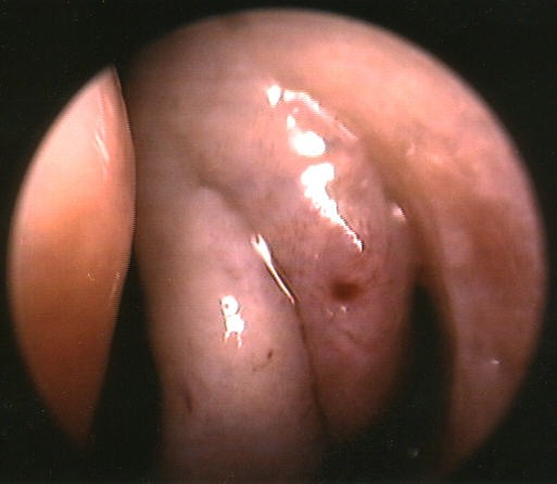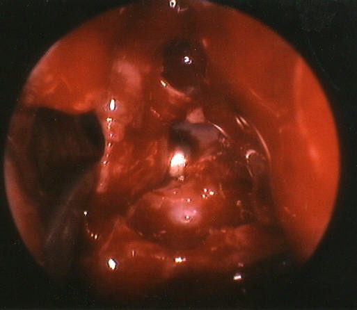 The picture above demonstrates the natural drainage pathway for the bulla ethmoidalis: the majority of the anterior ethmoid cell system. It typically drains posteriorly into the retro-bullar space. The probe is seen passing into the retro-bullar space and the tip is seen through the drainage pathway. This is on the patient's left side. These are very normal findings, but they are not often visualized this well, or discussed in textbooks. |