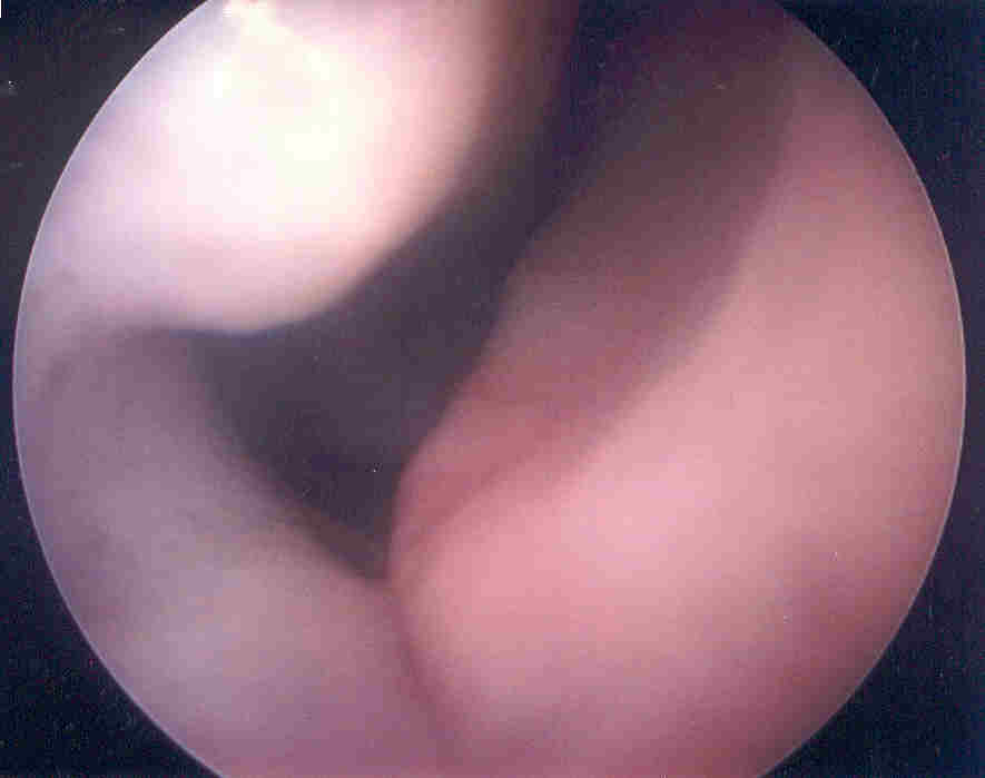| The picture above is of a 12 year-old girl's right nasal cavity. Her septum is pushed toward the right as her cartilage grows beyond the confines of the bone around it. A septoplasty is not a consideration in someone until their facial growth is completed - at perhaps 18 years. | ||||||||||||||