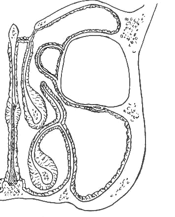 | The picture above displays the outflow tract for the ethmoid bulla. Attention to details, such as removing the bridge of tissue around this tract, leads to more rapid healing and more successful surgery | ||||||||||||||||||||