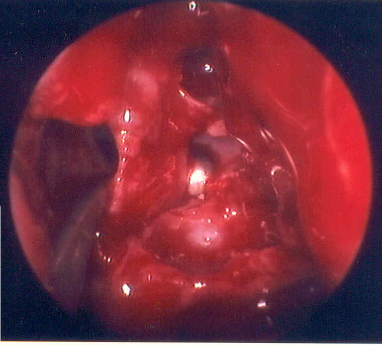 | This picture was taken during a typical case. The patient presented with acute exacerbations of chronic rhinosinusitis. The picture illustrates an opening into a concha bullosa, or a sinus within the middle turbinate, on the patient's right side. The lateral wall of this sinus will be removed to provide drainage for this sinus, and improve the drainage pathways for the other surrounding sinuses. There is always some bleeding, but with good vasoconstriction it is not too voluminous. This patient went on to heal very nicely and felt "a hundred times better." | ||||||||||||||||||||