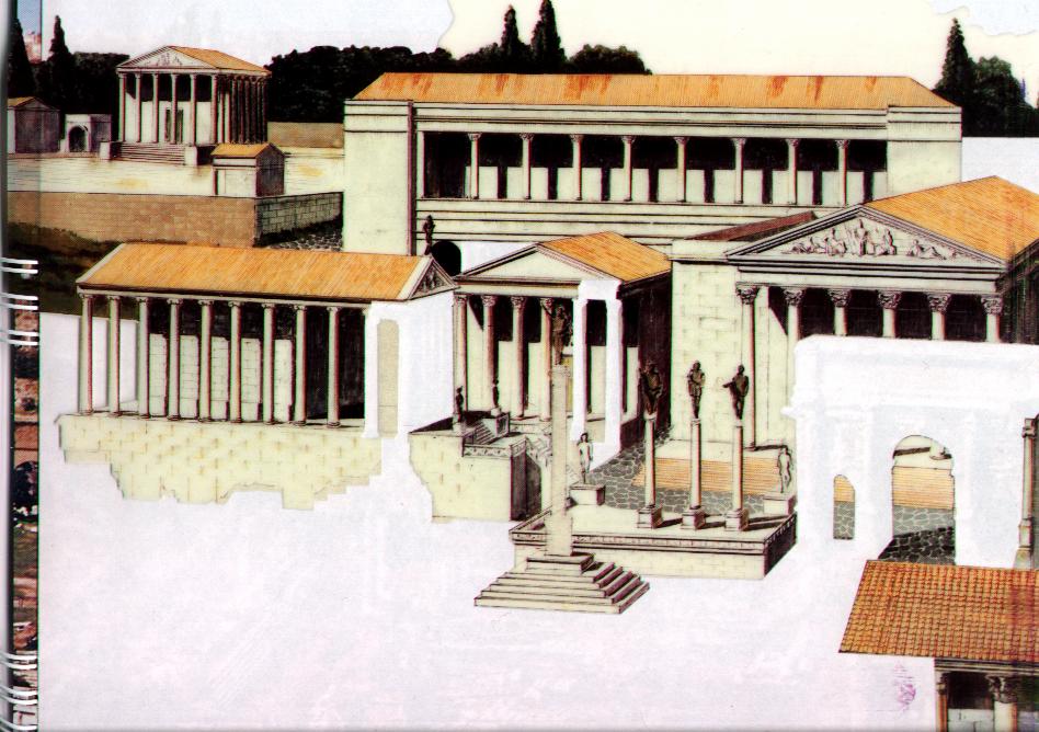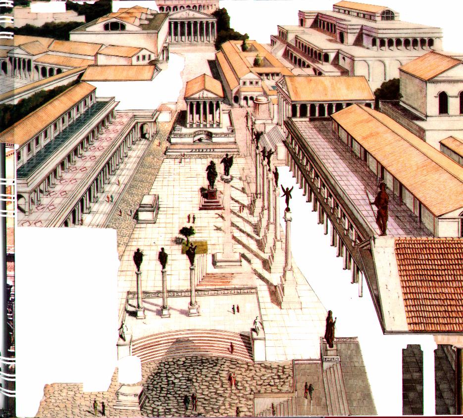 | An incredible picture of what the Roman center of city looked like. I got this scan out of a book I got for tourists called "Rome then and Now" It was really awesome and I hope that this picture will hope to help someone create a fantasy city just as cool! |