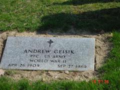Andrew Geisik Born: 1909, Morris Co., New Jersey Died: 1969, Rockaway, Morris Co., New Jersey Parents: Mr. & Mrs. Geisik Buried: Rockaway Presbyterian Cemetery, Rockaway, Morris Co., New Jersey Military Service: private, U.S. Army, World War II