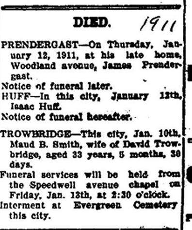 David Jarrard Trowbridge was named after his first cousin, David Trowbridge Jarrard, who died the same year David was born. According to a 1900 census, David was living with his father-in-law, Jacob Smith, and Mary Jane Smith, his mother-in law. Other people living in the Smith household also included David's one year old son, Gilbert, David's wife Maud Bertha, his brother-in-law, Oscar, and his sister-in-law, Gertrude. So, for a time, the entire family lived in the same household during the late 1890's to early 1900's. According to Francis Bacon Trowbridge, in 1909 David Jarrard was a carriage painter. On Jan. 10, 1911, Maud Bertha died of double pneumonia, and was buried in Evergreen cemetery. The following year, David and Maud's daughter Mabel died of pneumonia, and was buried next to her mother in an unmarked grave. Later that year David married a second time to Susan Lee Smith on May 17, 1912. It is unknown if she was related to David's first wife, Maud Bertha, if she was, she may have been a cousin. By the 1920 census, David is listed as living with his second wife, Susan, and his children Lois, David Henry, Charles William, and Russell Francis. His occupation was still that of a carriage painter. The following year, on Jan. 25, 1921, David and Susan Lee had a stillborn baby, who was buried at Evergreen Cemetery.