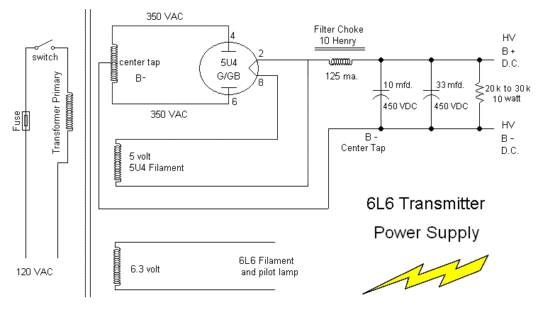 5U4G Power Supply for the 6L6 TransmitterThe power supply circuit I chose for my 6L6 transmitter is fairly common. It is a standard power supply that can be used for many projects. The 5U4 rectifier tube is capable of handling a wide range of loads. The 5U4 filament requires 5 volts at 3 amps. ![]() When choosing a transformer be sure that filament voltages are correct as well as the amperage ratings. Many transformers are 5 volt @ 2 amps. Using a 5U4 rectifier would eventually ruin the transformer. You could use a 5Y3 rectifier tube which is 5 volts @ 2 amps. The 5U4 and 5Y3 use the same tube socket. ![]() The high voltage windings are a little easier. Choose a transformer close to the voltage you want. The choke, filter capacitors and bleeder resistor will determine your final output . Be sure the milliamp rating is equal or greater that what you need. I prefer the higher rating. My power supply uses choke input filtering. This simply means that the choke goes before the filter capacitors. This helps with voltage regulation which is perfect for a CW transmitter. The filter choke smoothes the AC ripple. Be sure the milliamp rating matches or exceeds the load. A common value for filter chokes is 10 henry. Choose a choke around this value. I have never heard the difference between a 8 or 12 henry choke. ![]() Tube data sheets will provide information on what value your filter capacitor should be. In this power supply a 10 mfd. followed by a 33 mfd. provides adequate filtering. Going up in value will raise your B voltage. The bleeder resistor drains the filter caps after turning the power supply off and provides a small load on the power supply. My power supply provides 362 VDC with 20k resistor. Going to a 40k or higher resistor would raise the B voltage. This power supply provides high voltage which can be LETHAL. Use extreme caution and seek help if needed. Before touching anything under the chassis, turn the power supply off and wait a few minutes. ![]() After all the checking out is done, hook it up to a favorite project, like the 6L6 Transmitter. Get on the air and have fun. Look for you there.