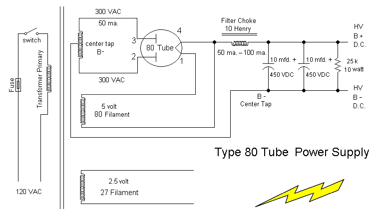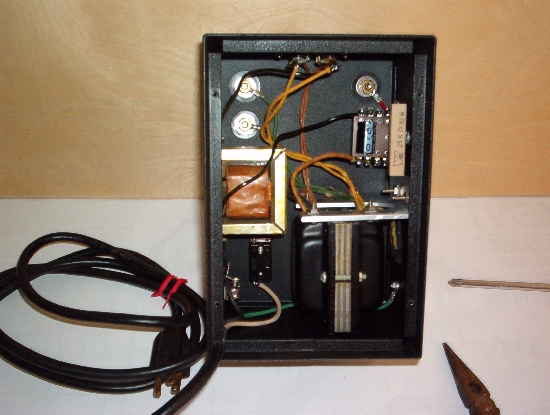 KC5LDO - Type 80 Tube Power SupplyHere is my newest power supply that was designed for the 1929 Hartley transmitter. It is a basic P/S with choke input filtering. The type 27 tube used in the Hartley and the type 80 rectifier were both introduced in 1927. The obvious choice was a power supply using a type 80 rectifier. The 80 is a full wave rectifier requiring 5 volts @ 2 amps for the filament. I chose a balloon shaped ux-280 over the more common shoulder type 80. ![]() ![]() I decided to be a little more creative and to deviate from the conventional flat chassis design. I had an old DeVry multimeter in the junk box that had a nice steel cabinet with a crinkle finish. It measured 4.5 inches deep by 5.5 inches wide and 8.0 inches tall. ![]() The back of the meter became the front of the P/S with a screen in back for safety and ventilation. Use caution when using or building tube power supplies as voltages can be LETHAL and if unsure of anything, seek help as needed. ![]() Luckily I was able to purchase a NOS Utah transformer with the correct voltage and a NOS Allied Knight choke rated @ 10 henries and 90 ma. A super deal at 10 USD a piece. The binding post and other small parts came from the junk box. I had to mount the transformer upside down to keep the lead lengths from being too excessive. The bracket was fabricated from aluminum. With careful planning I was able to fit everything inside beautifully. ![]() The P/S provides 2.5 VAC for the filament and 308 VDC for B voltage. The key down voltage with the Hartley is 248 VDC. With the Hartley set at 40 ma. this provides about 4 watts output. The maximum plate voltage for the type 27 tube is 180 volts. They seem to operate at 250 volts with no problems. ![]() This power supply was another fun project with satisfying results. The unconventional look is an added bonus.