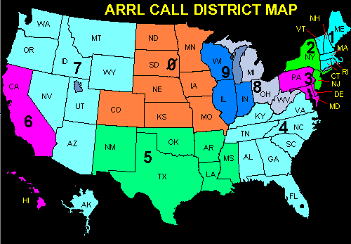 Call Sign / State /W0 Colorado, Iowa, Kansas, Minnesota, Missouri, Nebraska, North Dakota, South Dakota /W1 Connecticut, Maine, Massachusetts, New Hampshire, Rhode Island, Vermont /W2 New Jersey, New York /W3 Delaware, D.C., Maryland, Pennsylvania /W4 Alabama, Florida, Georgia, Kentucky, North Carolina, South Carolina, Tennessee, Virginia /W5 Arkansas, Louisiana, Mississippi, New Mexico, Oklahoma, Texas /W6 California /W7 Arizona, Idaho, Montana, Nevada, Oregon, Washington, Utah, Wyoming /W8 Michigan, Ohio, West Virginia /W9 Illinois, Indiana, Wisconsin AL0-7, KL0-7, NL0-7, WL0-7 Alaska AH6-7, KH6-7, NH6-7, WH6-7 Hawaii